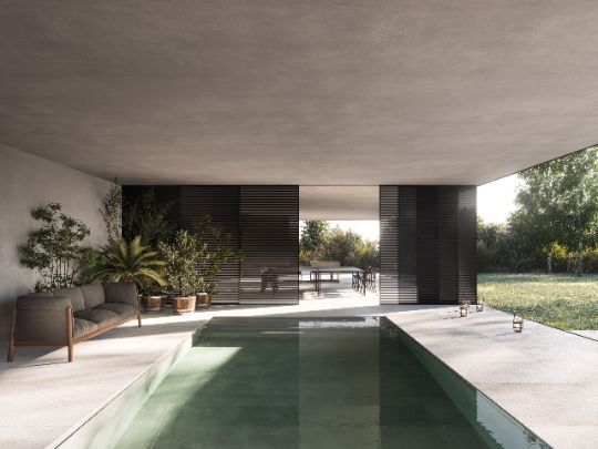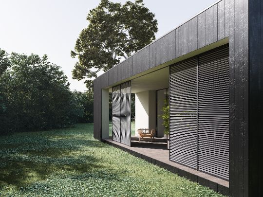 Levante sunshade and windbreak panels regulate light and visual connections both from the outside and from the inside of the living space.