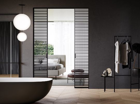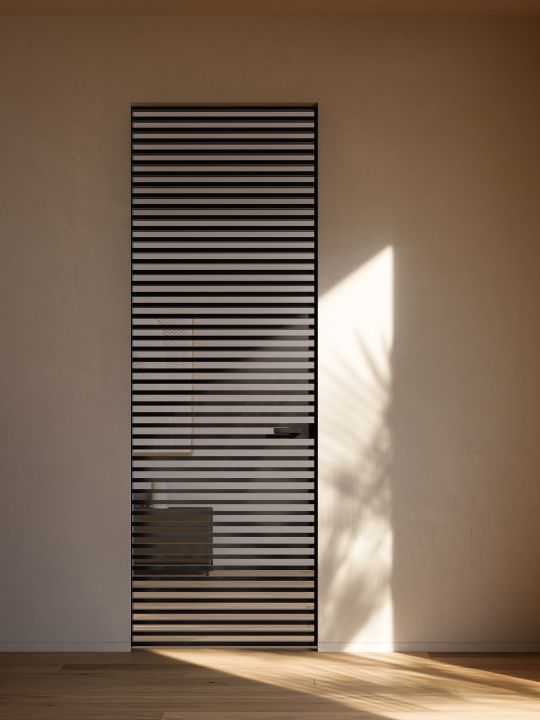 The Line glass door collection is characterized by a door with an aluminum frame (like the one in the Mitica collection) with a central glass to which aluminum crosspieces are applied on both sides of the glass.