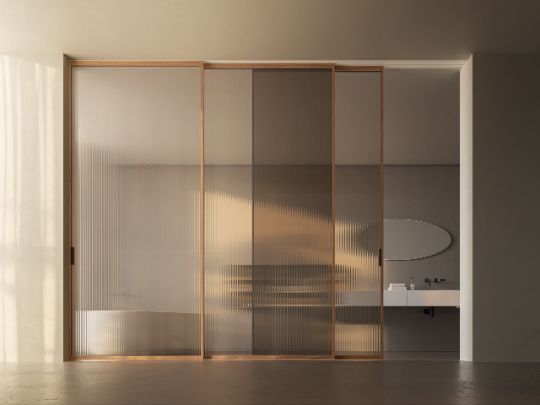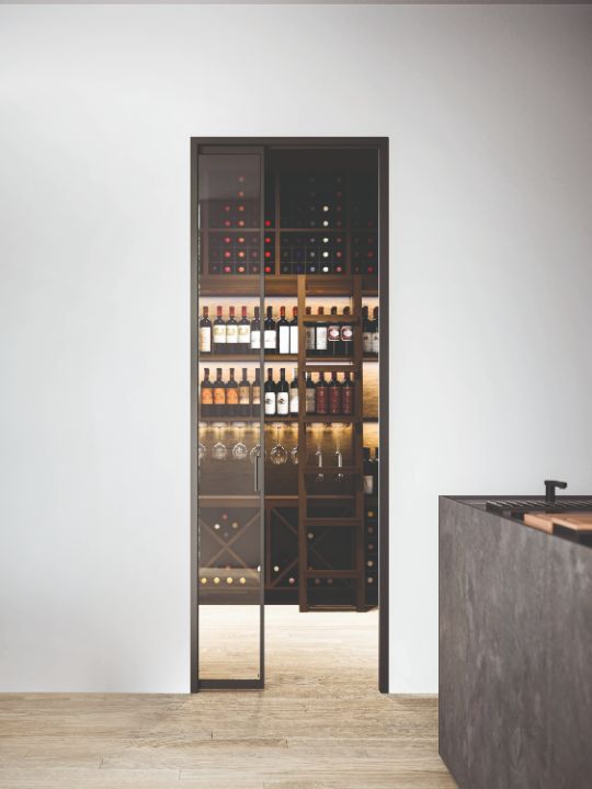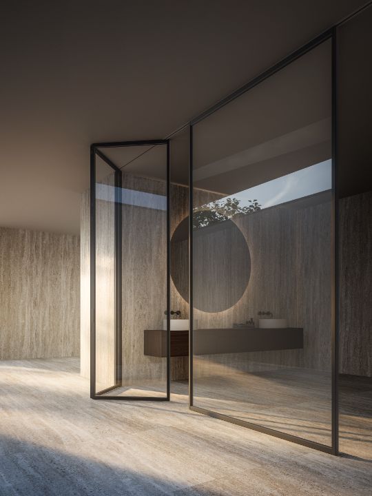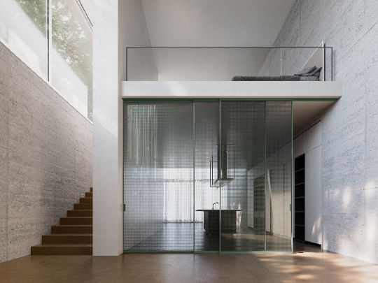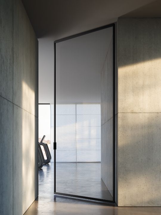 The Mitica series of interior glass doors is distinguished by its rigorous aesthetics given by the aluminum profile that houses the glass centrally and by the geometry of the door frame which is made with 18×38 mm uprights and 36×38 mm crosspieces.